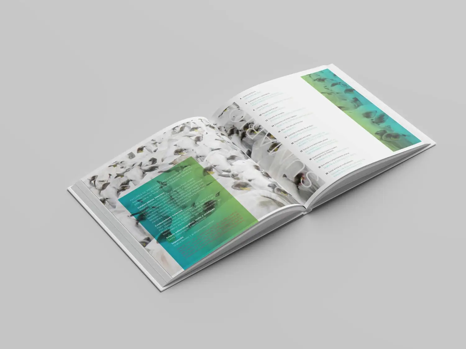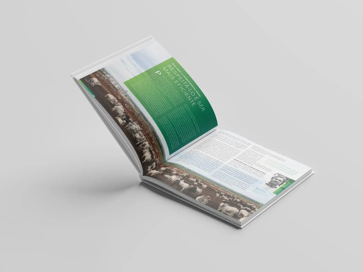 Publicação técnica da Bosch sobre pecuária de precisão. O livro em formato quadrado alia design arrojado a informações limpas e claras, respeitando o Design Guide da Bosch.